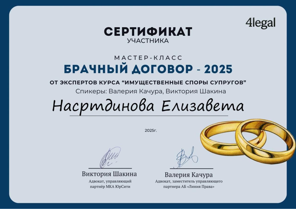 В 2025 году прошла мастер-класс "Брачный договор - 2025" от экспертов курса "Имущественные споры супругов"